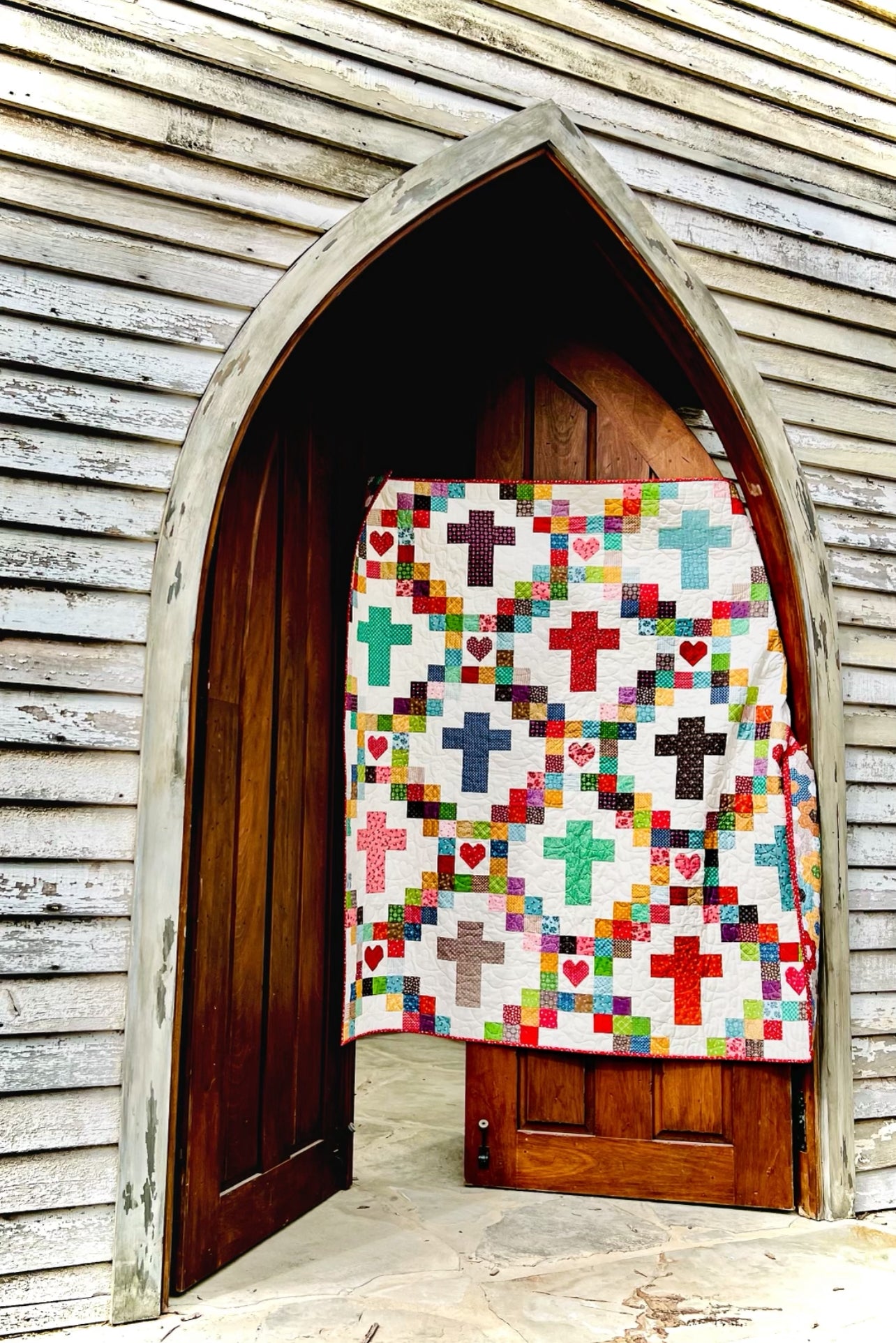 "In the Garden" is a beautiful hymn that inspired this design! This quilt is a colorful collage of piecing meant to represent a blooming garden of flowers. A pattern with the advantage of a quick, efficient assembly and a happy, vintage feel.