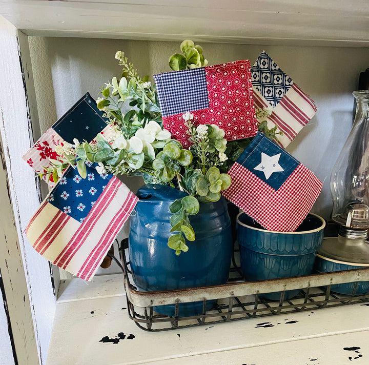 These adorable little flags look fabulous tucked in places around your home for summer. They are so fun and easy to make, put them in gifts or decorate the porch.